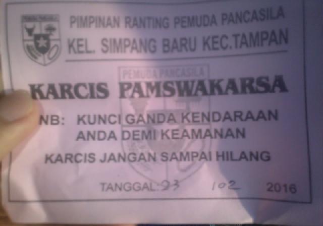 PEKANBARU (riaumandiri.co)-Oknum mengaku anggota Pemuda Pancasila Kelurahan Simpang baru, memungut parkir Rp3.000 kepada pengunjung Stadion Utama Riau, di Jalan Naga Sakti, Kelurahan Simpang Baru, Kecamatan Tampan. Akibatnya, masyarakat menjadi resah.