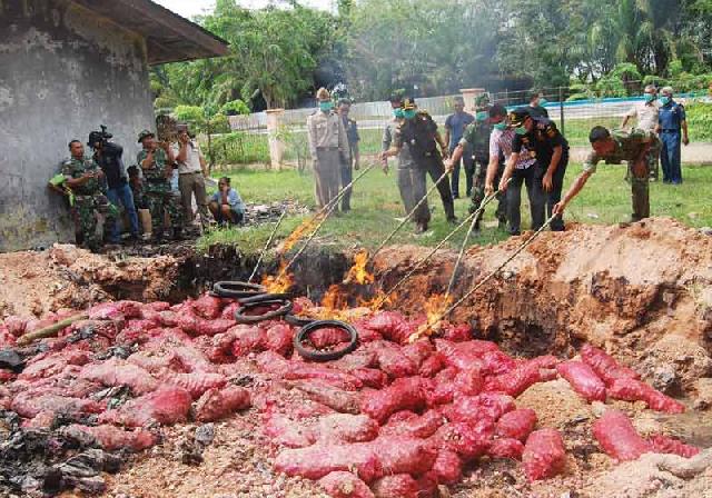 Acara pemusnahan diakhiri dengan penandatanganan berita acara oleh Kepala Bea Cukai Bengkalis, Kasat Reskrim Polres Bengkalis, Kasi Pidsus Kejari Bengkalis, perwakilan dari Pengadilan Negeri Bengkalis, Danramil, Syah Bandar dan tersangka. (man)