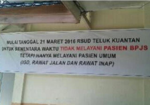 Pengumuman tersebut juga disampaikan pihak RSUD melalui spanduk yang berisi pemberitahuan tidak melayani pasien BPJS terhitung mulai Senin 21 Maret 2016. Belum diketahui pasti sampai kapan masyarakat yang menjadi peserta BPJS di Kuansing tidak mendapatkan haknya sebagai pasien BPJS.