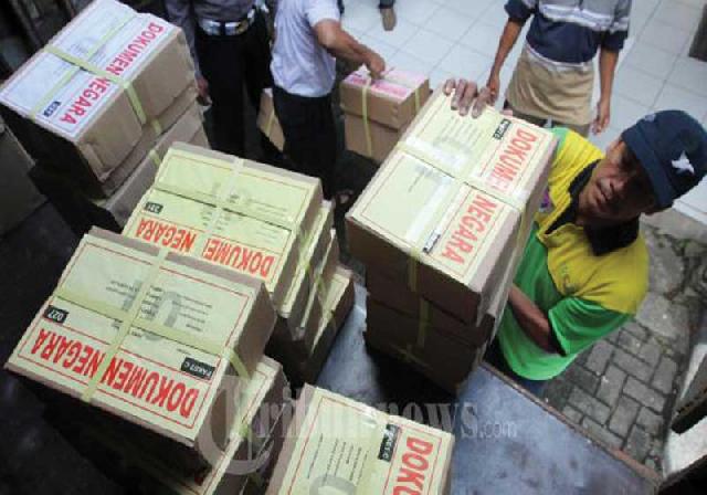 DUMAI (riaumandiri.co) -- Soal dan lembaran jawaban komputer ujian nasional tahun pelajaran 2015/2016 tiba di Dinas Pendidikan Kota Dumai, Selasa (29/3). Distribusi logistik tersebut dalam pengawalan ketat aparat kepolisian.