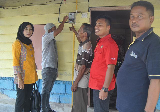 Warga menyaksikan petugas PLN rayon Pasir Pengaraian mengkoneksikan jaringan listrik ke rumah mereka hingga menyala.