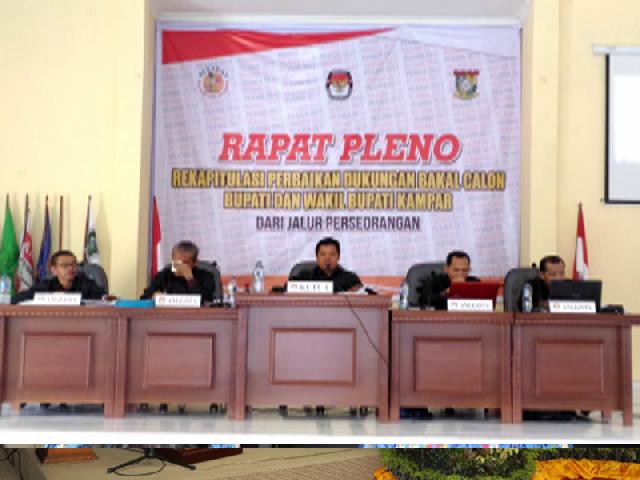 BANGKINANG KOTA (RIAUMANDIRI.co)-Komisi Pemilihan Umum (KPU) Kampar melakukan Rapat Pleno rekapitulasi perbaikan dukungan bagi 2 bakal pasangan calon (bapaslon) independen Jawahir-Bardansyah dan Alfisyahri-Wibowo, Jumat (21/10) pagi hingga menjelang salat Jumat.