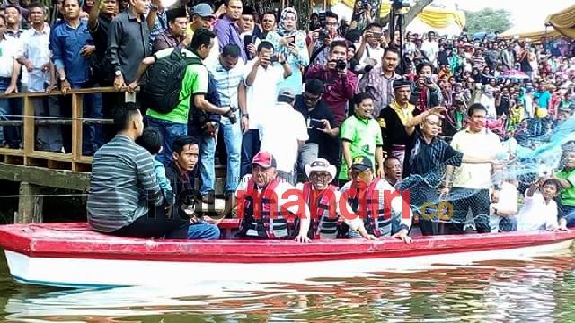 GEBERNUR Riau, Arsyajuliandi Rachman bersama Ketua DPRD Kampar saat ikut mencari ikan pada event Maawuo Danau Bokuok (Foto: Ari)