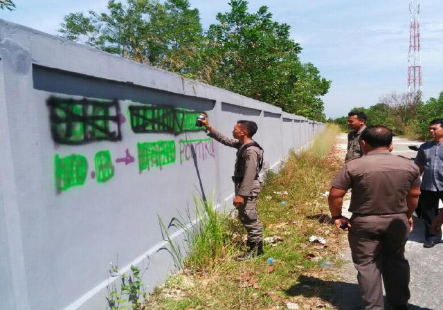 BANGKINANG KOTA(RIAUMANDIRI.CO) - Banyaknya coretan di dinding maupun pagar (vandalisme) terkait simbol-simbol pasangan calon (paslon) Bupati-Wakil Bupati Kampar terutama di Bangkinang Kota, mendapat tanggapan serius Panwascam Bangkinang Kota dan Satuan Polisi Pamong Praja (Satpol PP) Kabupaten Kampar. Mereka membersihkan coretan dinding yang meresahkan paslon Bupati-Wakil Bupati Kampar, Selasa (10/1).