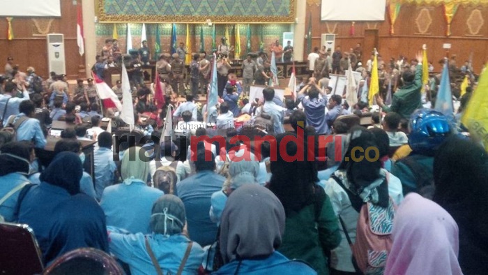 Momen ini tidak disia-siakan pendemo yang memenuhi ruang Paripurna, dengan mengisi setiap tempat duduk yang ada. Sementara, bendera dan atribut aksi juga terlihat di dalam Ruang Paripurna.