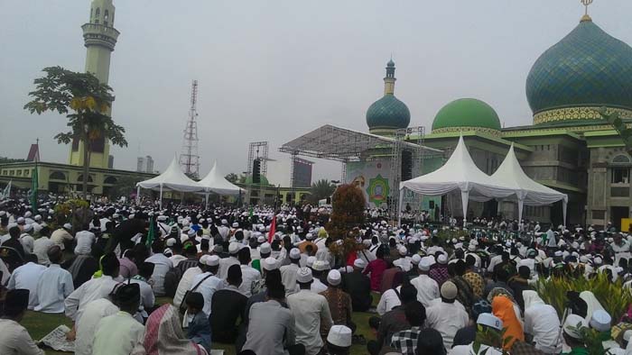 Pantauan riaumandiri.co di lokasi, halaman Masjid terlihat memutih dipenuhi umat yang rata-rata mengenakan pakaian serba putih dengan kombinasi hitam dan hijau. Sambil mengibarkan bendera-bendera kecil yang dibawa, mereka terus mengikuti acara dengan tertib.