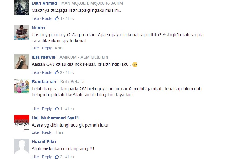 “@Uus__ @trans7 tolong ganti uus yg menghina ulama,sy fans setia ovj,sy akan stop nonton ovj selama uus masih ada,thaanks,” cuit netter. "Kasian OVJ kalau dia ndk keluar, bkalan ndk laku.." sahut netter lainnya.