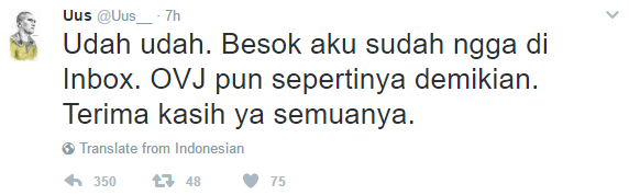 "Udah udah. Besok aku sudah ngga di Inbox. OVJ pun sepertinya demikian. Terima kasih ya semuanya." tulis Uus, kemarin.