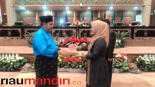 Ketua DPRD Riau, Septina Primawati, menyerahkan draft ranperda prakarsa DPRD Riau tentang penyelenggaraan keolahragaan, kepada Plh Sekdaprov Riau, Ahmad Syah Harrofie (Foto: RMC/Dodi)