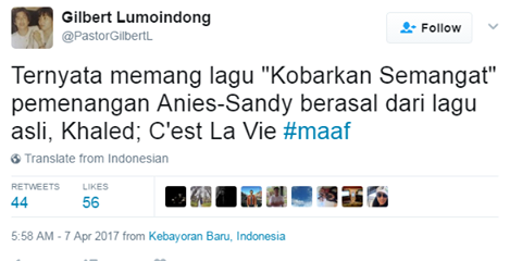 "Ternyata memang lagu "Kobarkan Semangat" pemenangan Anies-Sandi berasal dari lagu asli, Khaled; C'est La Vie #maaf," ujar pastor Gilbert melalui @PastorGilbertL di Twitter, Jumat, (7/4/17).