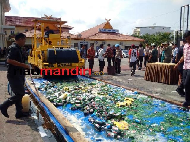 Disaksikan Kapolres Donal AKBP Donal Happy Ginting, Dandim 0320 Dumai Letkol Kav Rendra Siagian, dan pimpinan Forkompimda lainnya, sebanyak 712 botol/kaleng miras berbagai merek, 12 jeregen miras tradisional jenis tuak, 29 slop rokok, makanan kadaluarsa 51 kaleng/bungkus, 178 kotak mercon, dimusnahkan dengan cara dilindas dengan alat berat.