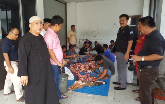 Proses penyembelihan dilakukan usai Salat Jumat, pada pukul 14.00 WIB. Tampak hadir menyaksikan kegiatan ini, CEO Haluan Riau Zico Basko, Brian Basko, Nando Basko, Wakil Pemimpin Umum/Direktur Bisnis dan Manajemen Haluan Riau yang sekaligus Direktur Utama PT CRMP, Sofialdi, Pemimpin Perusahaan Irman Sasrianto dan Wakil Pemimpin Redaksi Haluan Riau, Yadi Ismail. (rmc/nandra)