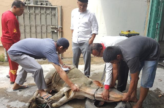 Proses penyembelihan hewan kurban Harian Umum Haluan Riau. (Foto: RMC/Nandra)