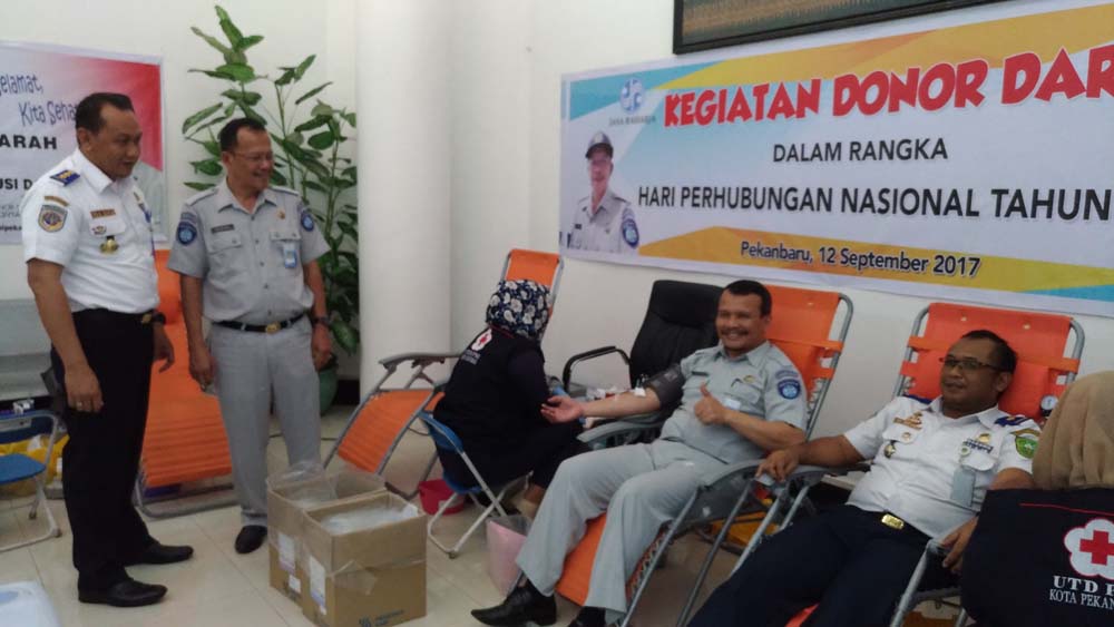 RIAUMANDIRI.co, PEKANBARU - PT Jasa Raharja (Persero) bekerjasama dengan Dinas Perhubungan Provinsi Riau menggelar kegiatan donor darah. Kegiatan yang digelar bersempena peringatan Hari Perhubungan Nasional (Perhubnas) 2017 ini, menargetkan 100 kantong darah.