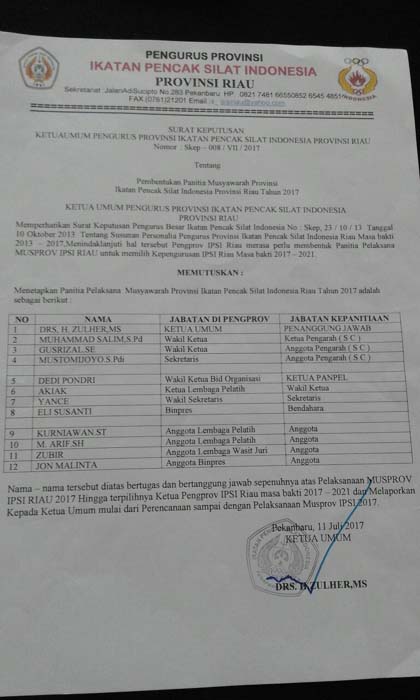 SK Panpel Musprov IPSI 2017 yang ditandatangani Ketua Umum IPSI Riau Zulher.