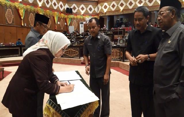 Ketua DPRD Riau Septina Primawati menandatangani MoU KUA-PPAS APBD P Riau TA 2017 pada Rapat Paripurna DPRD Riau