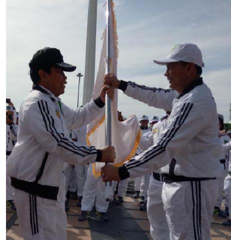 Usai melepas Kontingen Porprov, Wabup Rohul, H Sukiman, menyerahkan bendera pataka kepada Plt. Ketua KONI Rohul, Ujang Lurah, Kamis (26/10).