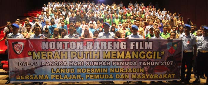 RIAUMANDIRI.co, PEKANBARU - Tentara Nasional Indonesia Angkatan Udara melalui Pangkalan Udara Roesmin Nurjadin Pekanbaru menggelar nonton bareng film "Merah Putih Memanggil", Kamis (2/11/2017).