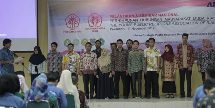 RIAUMANDIRI.co, PEKANBARU - Perhimpunan Hubungan Masyarakat (Perhumas) Muda Riau resmi dilantik Sabtu (11/11/2017) di Aula Gedung Universitas Muhamadiyah Riau.