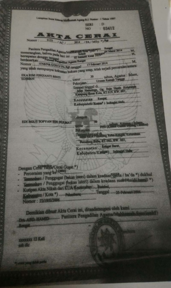 Menurut kuasa hukum ERF, Jaka Marhaen, klien mereka merupakan korban dari peristiwa tindakan kesewanang–wenangan yang dilakukan oleh EAS yang merupakan mantan suami klien sesuai dengan Akta Cerai yang dikeluarkan oleh Pengadilan Agama Rengat dengan No. 0153/AC/2014/PA/Msy.Rgt.