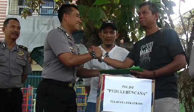 Wakapolresta Pekanbaru, AKBP Edy Sumardi didampingi Ketua PWI Pekanbaru, Agustiar, menyerahkan bantuan kepada Efrizon, wartawan korban kebakaran di Pekanbaru.