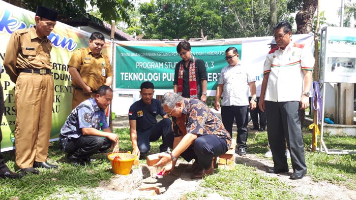 Rektor UR Prof Dr Aras Mulyadi meletakkan batu pertama pembangunan vokasi pulp and paper di Fakultas Teknik UR. (Foto: RMC/IST)