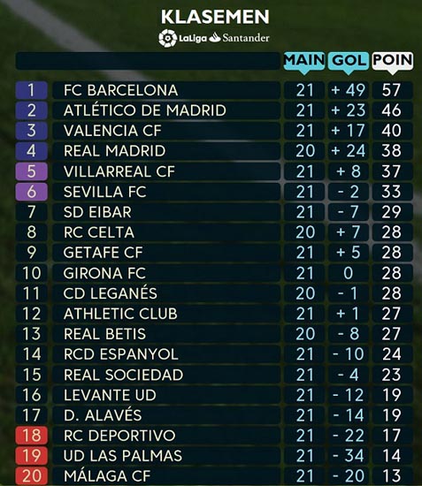 Berikut hasil pekan ke-21 dan klasemen sementara La Liga: