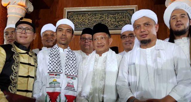 Mengenakan baju koko putih dan bersorban serta berpeci putih, Tito duduk berdekatan dengan Somad, didampingi Ustaz Arifin Ilham yang menjadi pemimpin majelis dzikir Az Zikra, dan sejumlah ulama lainnya.