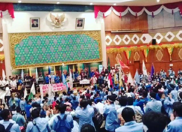 Pengunjuk rasa memenuhi ruang rapat DPRD Riau, mereka berorasi menolak kenaikan harga BBM yang dinilai menyengsarakan masyarakat (Foto: RMC/Dodi)
