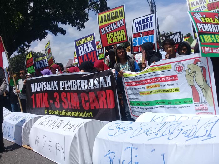 "Kebijakan Kominfo membatasi registrasi satu NIK untuk tiga kartu, secara otomatis mengakibatkan kerugian besar bagi pelaku usaha karena pembatasan stok. Untuk itu kami menolak pembatasan satu NIK untuk tiga kartu dalam aturan itu," kata Wahyudi selaku Ketua DPD KNCI Riau, saat ditemui di sela-sela aksi.