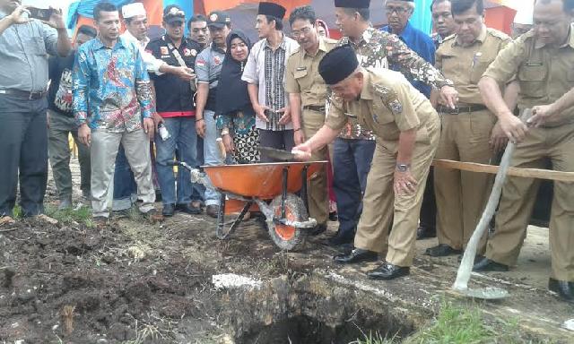 Bupati Pelalawan HM Harris saat meletakkan batu pertama pembangunan Musala Al-Barokah