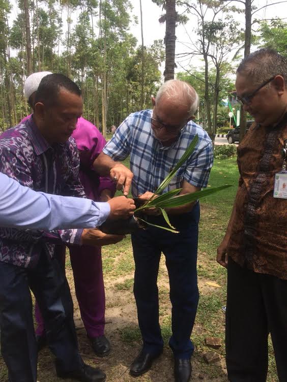 Prof Abdul Basit Qudah menanam bibit kurma di halaman Masjid Al Munawwaroh UIR.