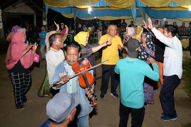RIAUMANDIRI.CO, KUANSING - "Sayang den du... Sayang den du... Ka nomor ompek". Begitu kira-kira bagian lirik alunan Randai Kuantan yang dimainkan seniman Kuantan Singingi, Sabtu (21/4/2018) malam. Tak tanggung-tanggung, lewat alunan lagu dan musik Randai, mereka mengiringi joget tokoh masyarakat Kuansing Sukarmis hingga calon Gubernur Riau Petahana Nomor Urut 4, H Arsyadjuliandi Rachman.