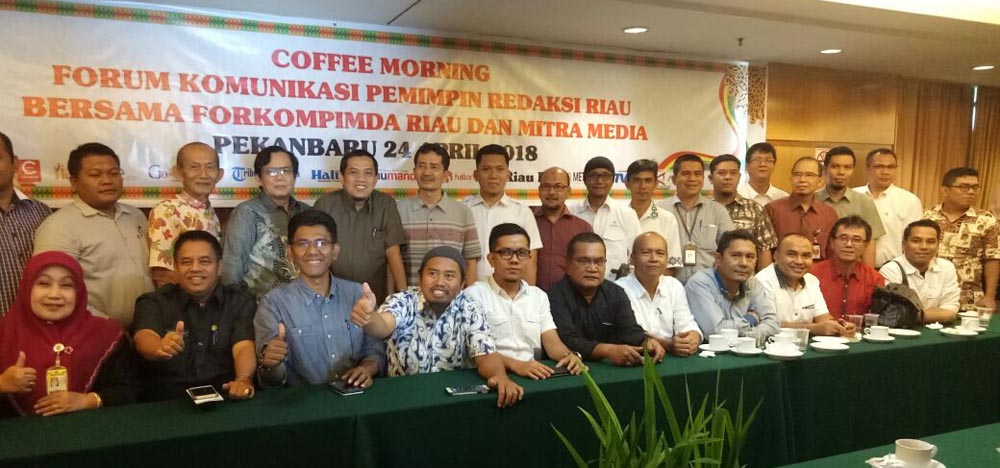 RIAUMANDIRI.CO, PEKANBARU - Sejumlah pemimpin redaksi media massa yang tergabung dalam Forum Komunikasi (Forkom) Pemimpin Redaksi (Pemred) Riau menggelar kegiatan silaturahmi bertajuk Coffee Morning, Selasa (24/4/2018). Kegiatan yang ditaja di Hotel Grand Suka Pekanbaru ini, dihadiri oleh Forkopimda Riau dan Kota Pekanbaru, perwakilan Pemkab/Pemko se-Riau, rektor sejumlah perguruan tinggi dan pimpinan serta humas berbagai perusahaan BUMN/swasta di Bumi Lancang Kuning.