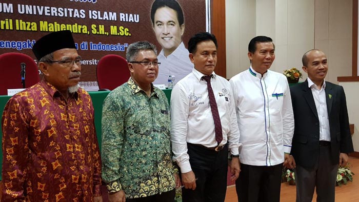 RIAUMANDIRI.CO, PEKANBARU - Mantan Menteri Hukum dan HAM Prof Dr H Yusril Ihza Mahendra, SH, MSc menyampaikan Kuliah Umum di hadapan 500 lebih mahasiswa Fakultas Hukum Universitas Islam Riau, Senin (30/4/2018). Acara yang berlangsung di Auditorium H Soeman Hs Pekanbaru itu dihadiri Ketua YLPI Riau Drs H Mukni, Wakil Rektor Bidang Akademik Dr H Syafhendry dan Ketua Umum IKA UIR Pusat, Dr H Firdaus, ST, MT. Dalam waktu bersamaan, Yusril selaku pemilik Kantor Hukum Ihza & Ihza menandatangani MoU (Memorandum of Understanding) dengan Dekan Fakultas Hukum UIR, Dr Admiral, SH, MH.