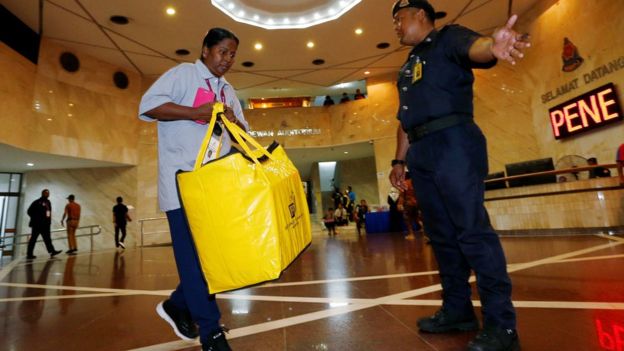 Petugas membawa kotak suara ke tempat penghitungan di Petaling Jaya, di dekat Kuala Lumpur.