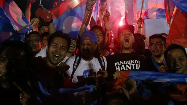Pendukung Pakatan Harapan merayakan kemenangan di Petaling Jaya, Kuala Lumpur.