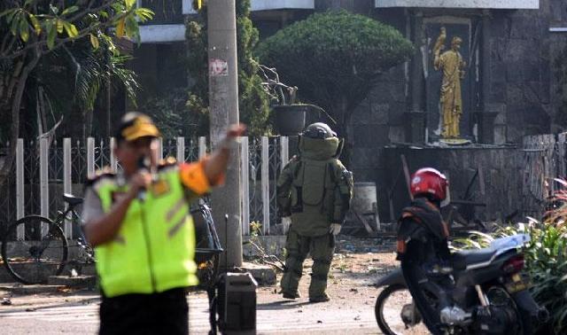 Seorang petugas Penjinak Bom (Jibom) melakukan identifikasi di lokasi ledakan yang terjadi di Gereja Surabaya
