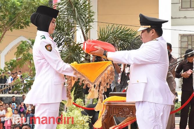 Kemudian, pada pukul 10.20 WIB, selaku inspektur upacara, Bupati Amril menyerahkan bendera Merah Merah Putih kepada Indah Septi Roza (buah hati pasangan Azwar dan Maisyarah) untuk dikibarkan. Pelajar SMA Negeri 3 Bengkalis ini pada saat upacara pengibaran bendera bertugas sebagai pembawa baki.