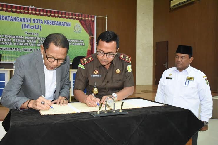 RIAUMANDIRI.CO, BANGKINANG - Pemerintah Kabaten Kampar dan Kejaksaan Negeri Kampar menandatangani nota kesepahaman atau MoU tentang Pengawal dan Pengaman Pemerintahan dan Pembangunan Daerah (P4D) di aula Kantor Bupati Kampar, Rabu (5/9/2018). Hadir seluruh kades se-Kabupaten Kampar.