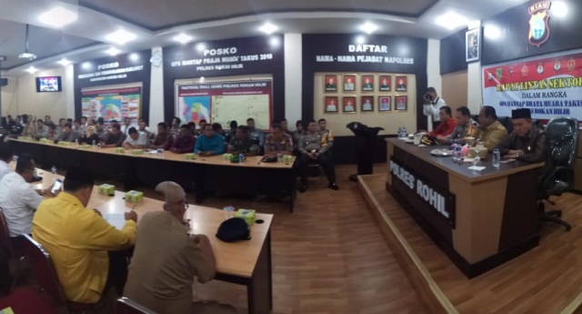 Rapat lintas Sektoral dalam rangka Operasi Mantap Brata Muara Takus 2019 yang dibuka oleh Wakapolres Rokan Hilir Kompol Wawan, turut dihadiri oleh seluruh Kapolsek di wilayah Rokan Hilir, juga sejumlah pimpinan parpol, ketua Bawaslu dan ketua KPU, dan wakil ketua DPRD Rokan Hilir.