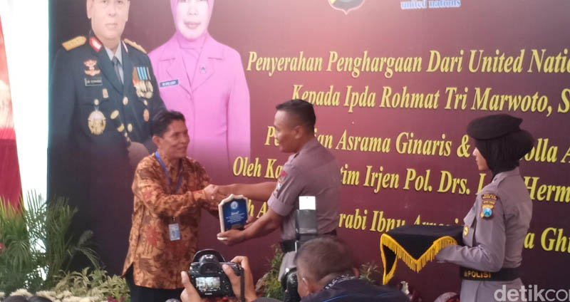 RIAUMANDIRI.CO, SURABAYA - Ipda Rochmat Tri Marwoto, anggota Brimob Madiun berprestasi karena menjadi orang tua asuh dari 79 anak baru saja menerima penghargaan dari United Nations Information Centre (UNIC) pada Senin (15/10/2018). Namun belakangan diketahui bahwa penghargaan itu palsu.