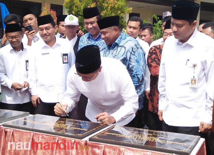 RIAUMANDIRI.CO, PEKANBARU - Menteri Agama Lukman Hakim Saifuddin meresmikan penegerian 48 Madrasah se-Indonesia, yang berpusat di MAN 3 Pekanbaru di Jalan HR Soebrantas, Pekanbaru, Senin (29/10/2018). Dari 48 Madrasah tersebut, 10 di antaranya berada di Riau, termasuk 2 madrasah di Pekanbaru.