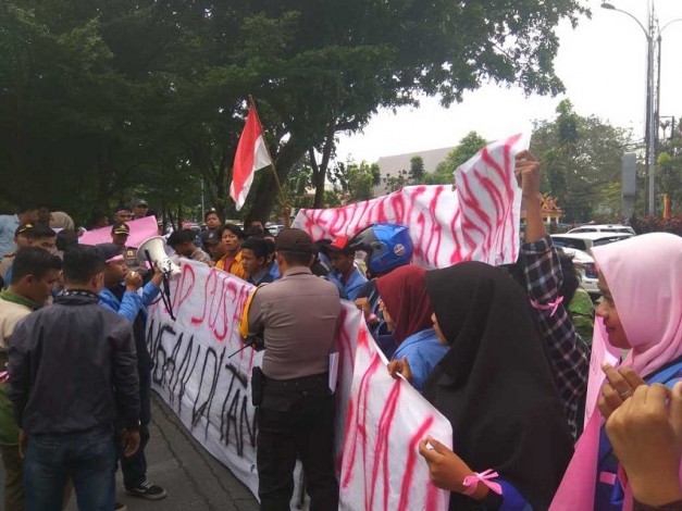 RIAUMANDIRI.CO, PEKANBARU - Puluhan mahasiwa yang tergabung dalam BEM Fakultas Dakwan dan Komunikasi (FDK) Universitas Islam Negeri (UIN) Suska Riau, Kamis (27/12/2018) melakukan aksi unjuk rasa di depan kantor DPRD Provinsi Riau.