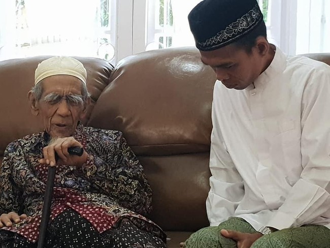 Dalam foto tersebut, UAS tampak mencium tangan Mbah Moen. Dia juga tampak membantu Mbah Moen berjalan di rumahnya.