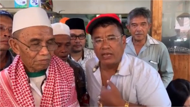 Disampingnya tampak seorang bapak-bapak mengenakan peci dan mengalungkan sorban.