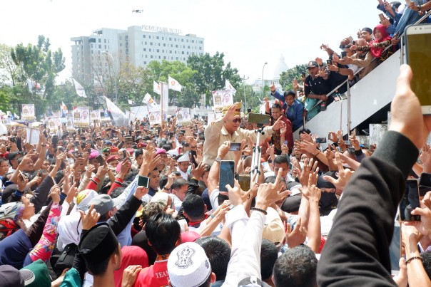 RIAUMANDIRI.CO, PEKANBARU - Ribuan simpatisan dan masyarakat tumpah ruah di Jalan Jenderal Sudirman, Pekanbaru, Rabu (13/3/2019) siang, menyambut kedatangan Calon Presiden 02, Prabowo Subianto.