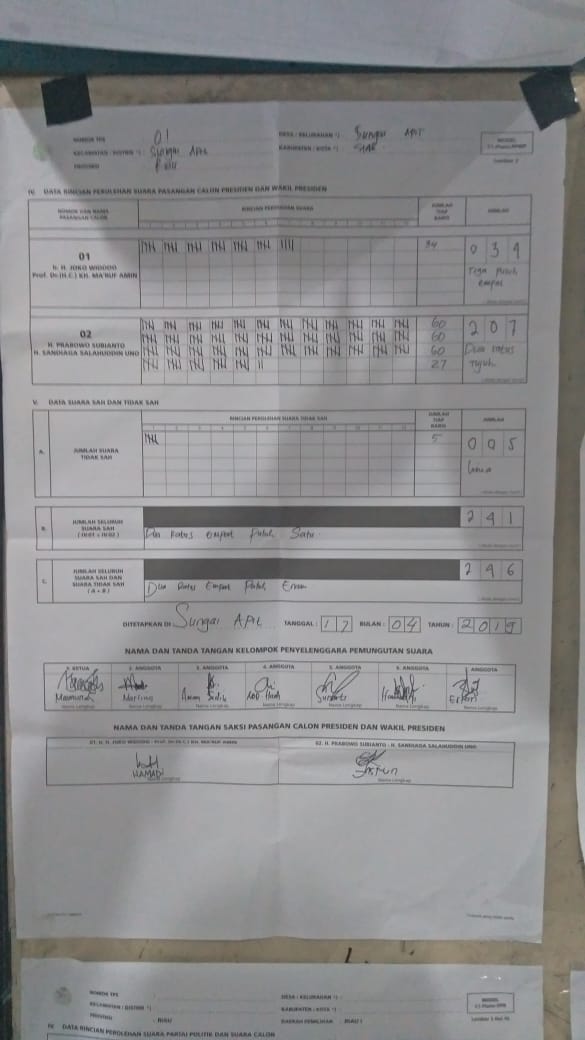 Dalam situs resmi KPU yang mencantumkan jargon KPUtransparan itu memaparkan data, pada TPS 01, Kelurahan Sungai Apit, Kecamatan Sungai Apit, Kabupaten Siak, Provinsi Riau. Jumlah suara sah 240, jumlah suara tidak sah 5, jumlah suara sah dan tidak sah 245 suara. Pemilih terdaftar dalam DPT 312 orang, yang menggunakan hak pilih 245 orang.