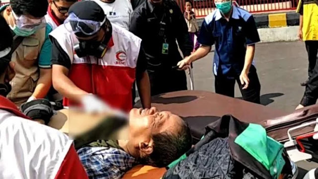 Pengemudi ojek online itu datang dengan diantar mobil ambulans berwarna putih dalam kondisi tak berdaya. Terlihat luka yang diduga luka tembak yang berada di dada sebelah kanannya.