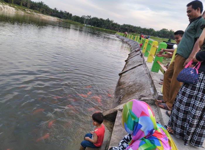 Tampak masyarakat bersantai dan memberi makan ikan di embung.